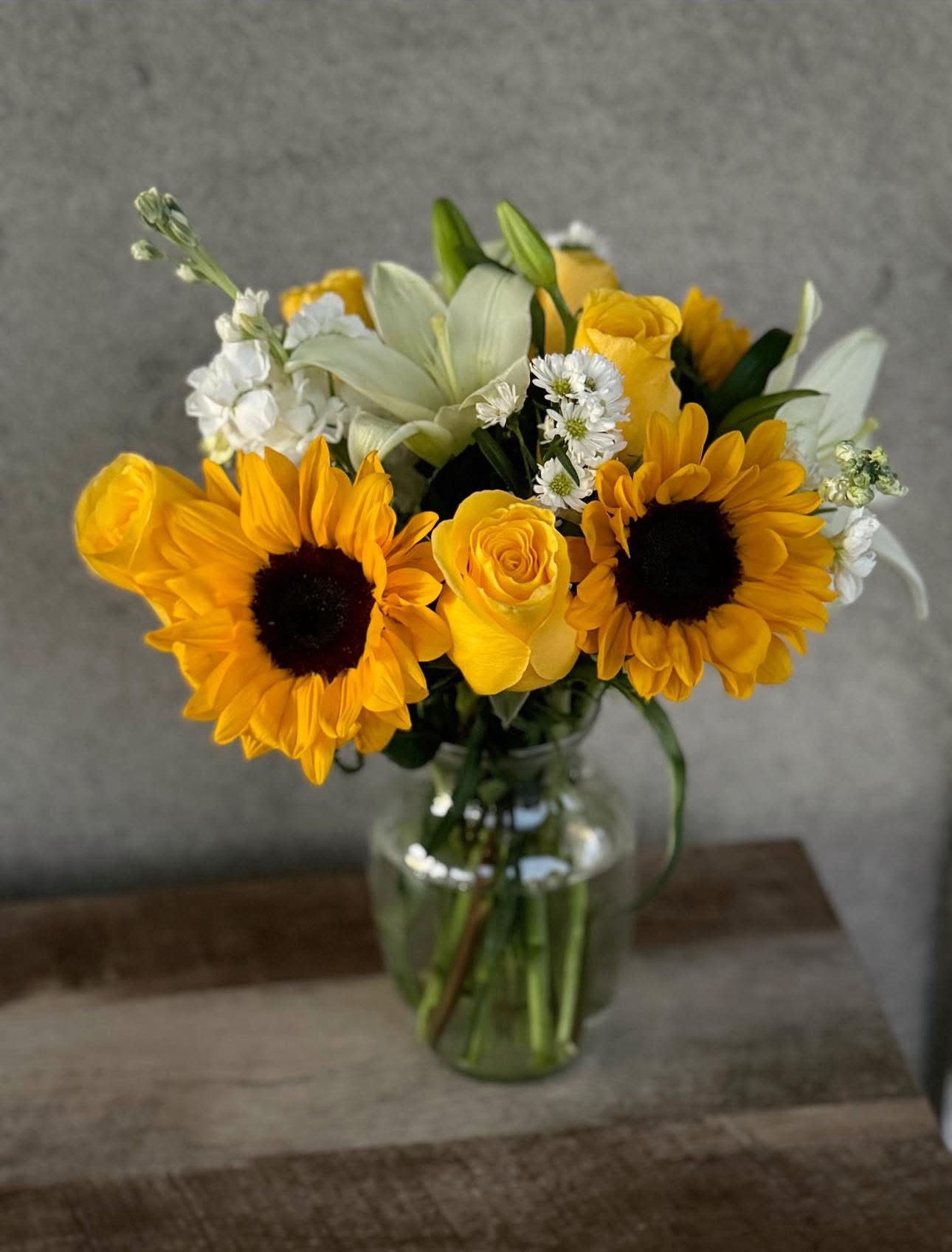 Este radiante arreglo se construye en torno a llamativos Girasoles, que simbolizan la adoración y la longevidad, perfectamente enmarcados por brillantes Rosas Amarillas y elegantes acentos blancos, como Lirios Blancos y flores de Alhelí (Stock). Un bouquet verdaderamente reconfortante, diseñado para llevar calidez y positividad a cualquier espacio.